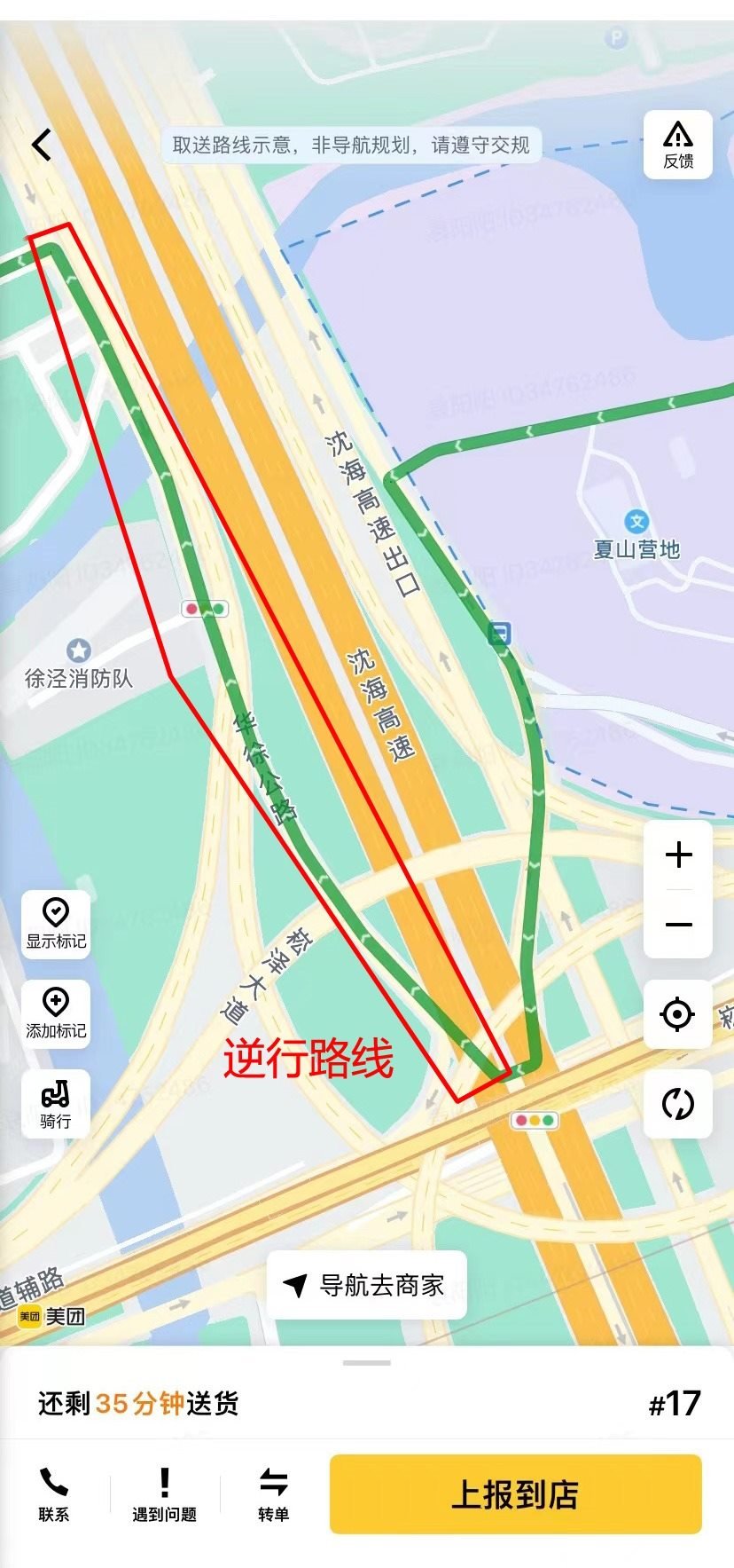 △出了寶山新業(yè)坊若是向北送餐,美團騎手的后臺界面可以看到系統(tǒng)規(guī)劃的就是逆行路線。