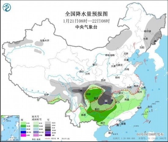 1月21日08時(shí)至22日08時(shí),內(nèi)蒙古中部、東北地區(qū)中東部、新疆南疆盆地西部、西藏南部和東部、青海南部、川西高原、陜甘南部、湖北大部、安徽南部、浙江大部、江西北部、湖南中北部、貴州大部等地部分地區(qū)有小到中雪或雨夾雪,其中,川西高原東部、湖北西南部、湖南西北部、重慶東部、貴州東北部等地部分地區(qū)有大到暴雪,局地大暴雪(20~25毫米)。江南中南部、西南地區(qū)東部和南部、華南北部和西部、臺(tái)灣島等地部分地區(qū)有小到中雨。內(nèi)蒙古中東部、東北地區(qū)西部部分地區(qū)有4~5級(jí)風(fēng)。渤海、黃海大部、東海大部、臺(tái)灣海峽、南海北部和西南部海域?qū)⑾群笥?~7級(jí)、陣風(fēng)8級(jí)的東北到偏北風(fēng)(見(jiàn)圖3)。