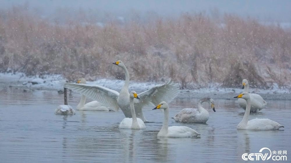 山西運城迎來降雪天氣,成群天鵝在鹽湖濕地嬉戲。