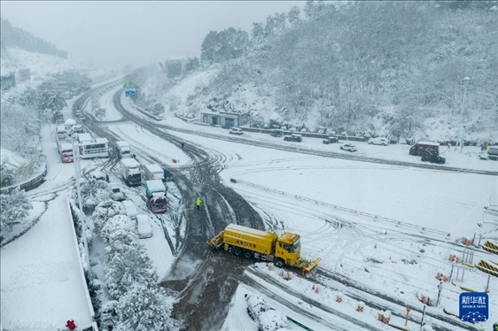 1月22日,在湖南省婁底市一高速收費(fèi)站,除雪車在作業(yè)(無(wú)人機(jī)照片)。近日,受寒潮天氣影響,我國(guó)多地迎來(lái)降溫降雪天氣,各地積極組織相關(guān)部門開展抗凝除雪工作,保安全保暢通。新華社發(fā)(吳永華攝)