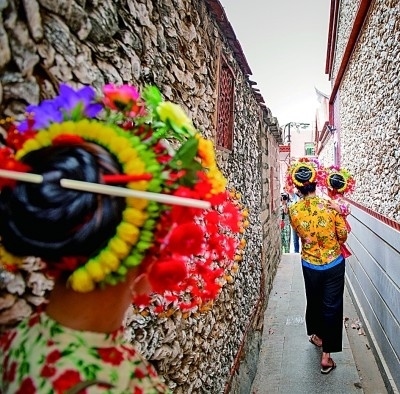 “今生戴花,來世漂亮”。在我國福建省泉州市的蟳埔村里,總能聽到這樣的話語。這座漁村,無論是巷子里拍照的姑娘,還是街邊滿頭銀發(fā)撬海蠣的阿婆,都盤發(fā)梳成圓髻,系上紅頭繩,插著滿頭花,成為村里靚麗的“風(fēng)景線”。五彩斑斕的簪花、象牙固定的發(fā)髻、蚵殼筑成的房屋……獨具特色的文化印記讓這座漁村迅速“出圈”,成為知名網(wǎng)紅地。
