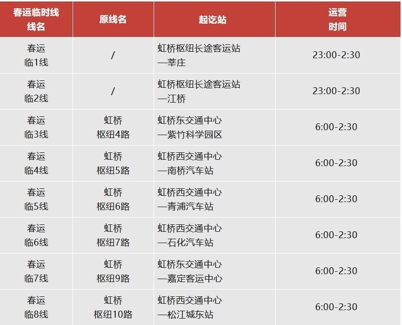 注:虹橋樞紐春運(yùn)專(zhuān)線(xiàn)運(yùn)營(yíng)日期為2月14日至3月5日。