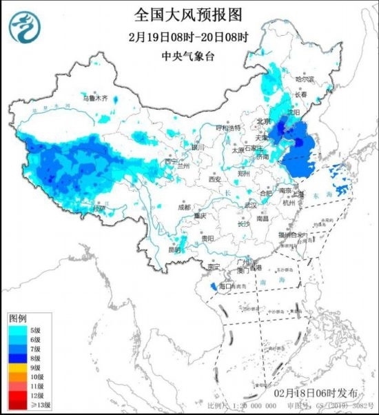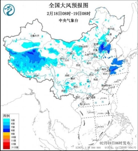 2月18日8時至19日8時,新疆南疆盆地東部、西藏中西部、青海南部、甘肅河西、內(nèi)蒙古中西部、遼寧中西部等地將有5~6級、陣風7~8級的大風;渤海、渤海海峽、黃海北部海域、東海北部海域?qū)⒂?~8級、陣風9~10級的大風。2月19日8時至20日8時,西藏中西部、青海南部、甘肅河西、內(nèi)蒙古中東部、遼寧西部和南部等地將有5~6級、陣風7~8級的大風;渤海、渤海海峽、黃海大部海域?qū)⒂?~8級、陣風9~10級的大風。中央氣象臺2月18日6時繼續(xù)發(fā)布大風藍色預警。