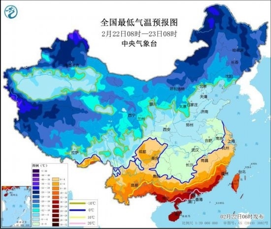 全國最低氣溫預報圖(2月22日8時-23日8時)