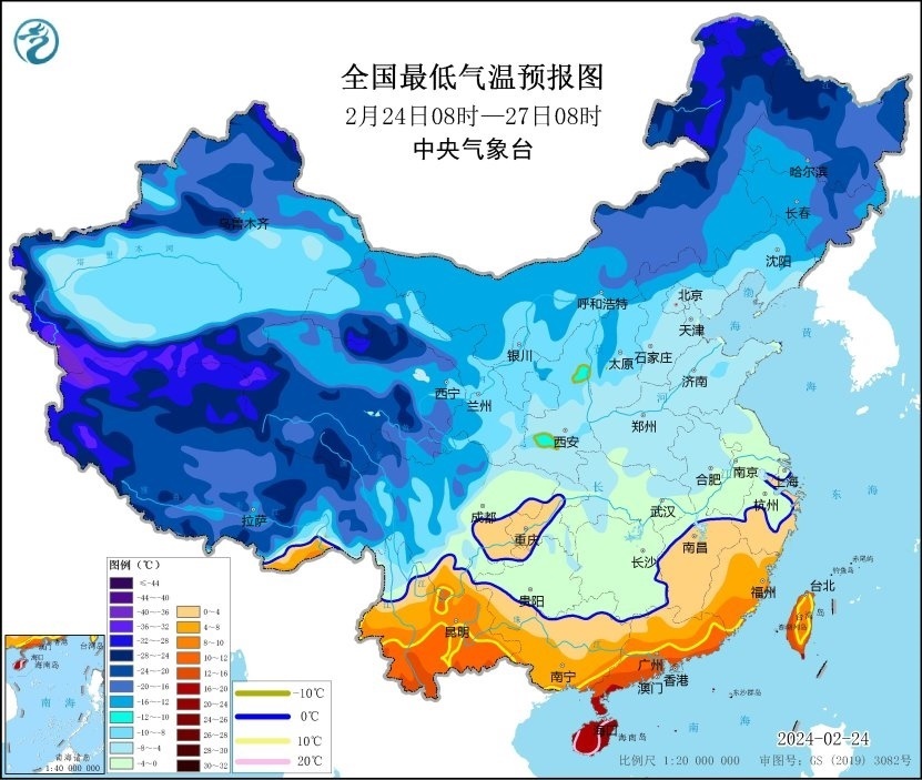 預(yù)計,2月24日08時至27日08時,江淮中西部、江漢大部、江南中部和西部、西南地區(qū)東部和北部、廣西、廣東北部以及陜西東南部、甘肅東南部、新疆沿天山地區(qū)、西藏南部等地的日平均氣溫較歷史同期偏低5℃以上,其中,湖北中部和南部、湖南大部、江西中部、貴州大部、廣西中北部、四川中西部、新疆沿天山地區(qū)等地的日平均氣溫較歷史同期偏低7℃以上,最低氣溫0℃線將位于貴州西南部、廣西北部、江西北部至江蘇南部一帶。