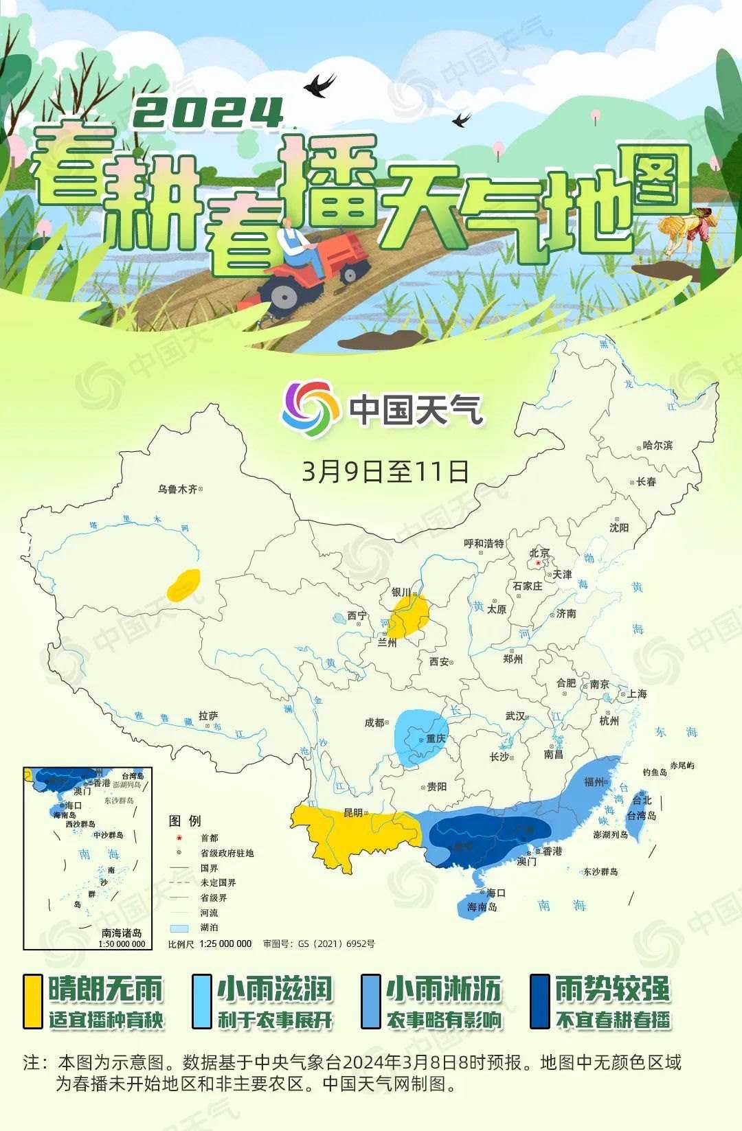 中國(guó)天氣網(wǎng)氣象分析師李靚介紹,3月9日至11日,廣西西部、廣東東部和北部、福建大部、海南島等地小雨淅瀝,對(duì)田間作業(yè)略有影響。廣西東部、廣東西部和中部有2至3天中雨,部分地區(qū)甚至將有大雨或暴雨,對(duì)春耕春播作業(yè)影響較為明顯。