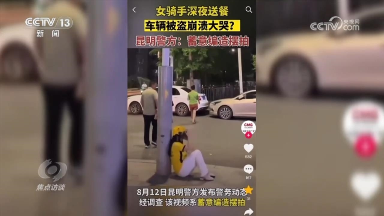 2023年8月3日,某網(wǎng)絡(luò)平臺發(fā)布了一個短視頻,除了哭泣聲,上面文字打的是“深夜,外賣姐姐送餐,下樓發(fā)現(xiàn)車被偷了”。然而,就是這樣一個時長僅10秒左右的視頻,當(dāng)晚瀏覽量已超6000萬次,并在多個平臺迅速傳播,進入熱榜,隨即點贊、收藏量超過10萬次。同樣,這些也引起了警方的關(guān)注,經(jīng)調(diào)查核實,該視頻為擺拍,發(fā)布者就是畫面中表演的女子,其丈夫在旁負責(zé)道具和指導(dǎo)。而他們當(dāng)時擺拍的全過程被大街上的戶外監(jiān)控記錄了下來。