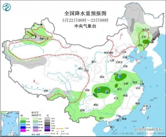 3月22日08時(shí)至23日08時(shí),新疆北部和南疆西部山區(qū)、內(nèi)蒙古東北部、黑龍江西部和南部、吉林中東部等地部分地區(qū)有小到中雪或雨夾雪,其中,新疆沿天山高海拔地區(qū)、吉林長(zhǎng)白山區(qū)等地部分地區(qū)有大雪(5~8毫米)。新疆伊犁河谷和準(zhǔn)噶爾盆地、吉林西部、遼寧中東部、河南中東部、蘇皖大部、湖北大部、湖南北部和南部、重慶、貴州北部、云南大部、廣西大部等地部分地區(qū)有小到中雨,其中,河南東部、湖北西南部、湖南西北部、重慶中部等地部分地區(qū)有大雨(25~40毫米)。內(nèi)蒙古東南部、華北北部、山東半島等地部分地區(qū)有4~6級(jí)風(fēng)。渤海、渤海海峽、黃海大部海域有5~7級(jí)風(fēng),陣風(fēng)8級(jí)。
