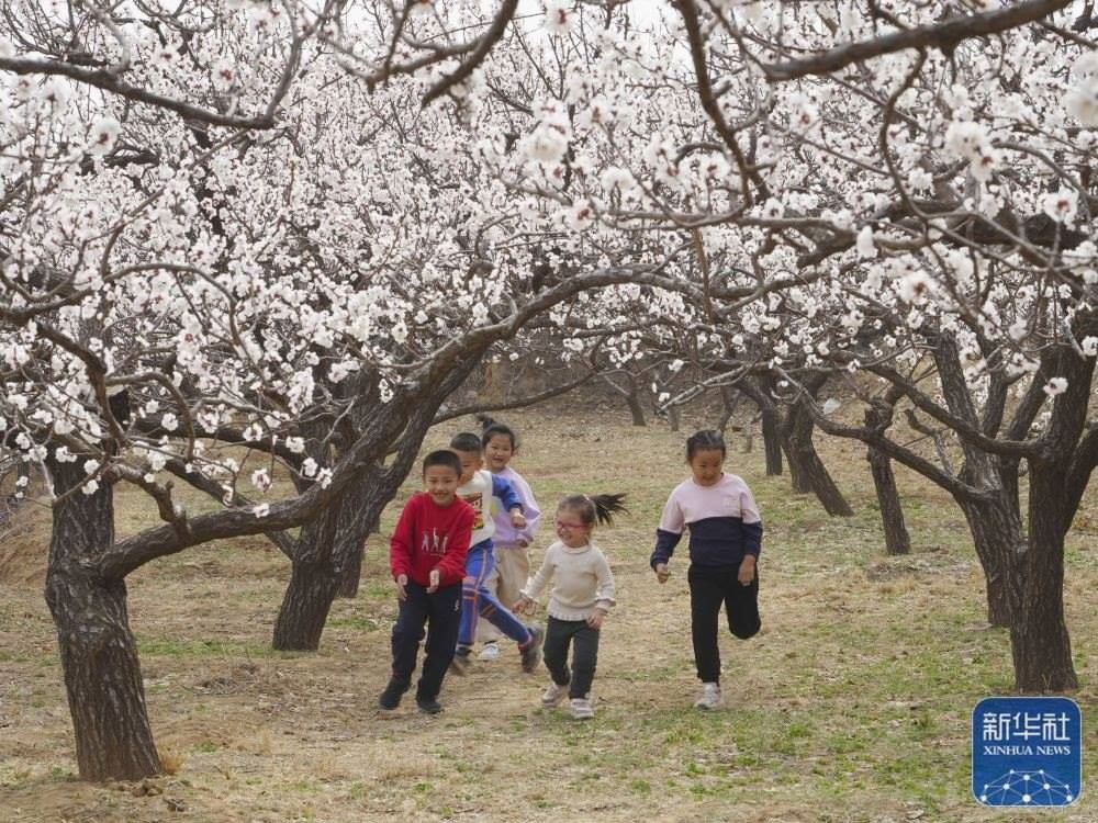 3月23日,小朋友在河北省石家莊市鹿泉區(qū)山南張莊村的杏林中玩耍。新華社發(fā)(閆志國(guó)攝)