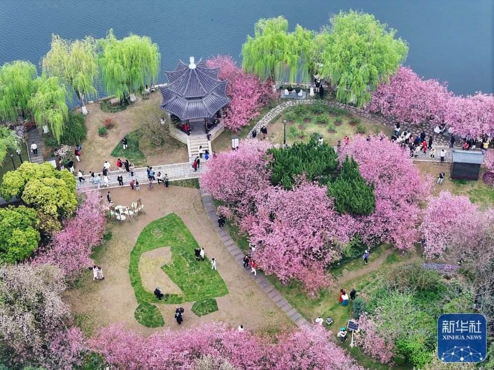 3月23日,游客在南京莫愁湖公園內(nèi)賞花游玩(無人機(jī)照片)。新華社發(fā)(楊素平攝)