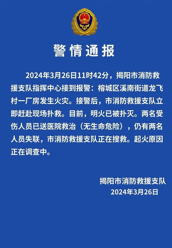 央視網(wǎng)消息:據(jù)“揭陽發(fā)布”微信公眾號消息,揭陽市消防救援支隊(duì)發(fā)布警情通報(bào),2024年3月26日11時42分,揭陽市消防救援支隊(duì)指揮中心接到報(bào)警:榕城區(qū)溪南街道龍飛村一廠房發(fā)生火災(zāi)。接警后,市消防救援支隊(duì)立即趕赴現(xiàn)場撲救。目前,明火已被撲滅。兩名受傷人員已送醫(yī)院救治(無生命危險(xiǎn)),仍有兩名人員失聯(lián),市消防救援支隊(duì)正在搜救。起火原因正在調(diào)查中。