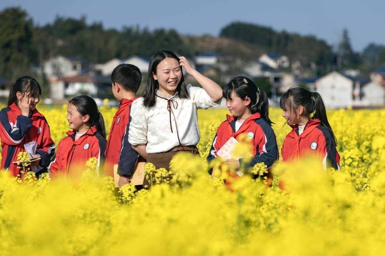 李柏霖不愿意讓孩子們覺(jué)得這樣的情緒是生活的全部。她把課堂搬到野外,在“搖搖花”開的時(shí)候帶孩子們?nèi)タ础皳u搖花”,油菜花開時(shí)去看油菜花。花也是詩(shī),家鄉(xiāng)也是詩(shī)——若非如此,老師為什么走了又回呢?