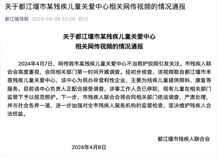 央視網(wǎng)消息:都江堰殘聯(lián)4月8日通報(bào),4月7日,網(wǎng)傳都江堰市某殘疾兒童關(guān)愛中心不當(dāng)照護(hù)視頻引發(fā)關(guān)注。市殘疾人聯(lián)合會高度重視,會同相關(guān)部門第一時(shí)間開展調(diào)查。經(jīng)初步核查,該視頻取自都江堰市禾苗殘疾兒童關(guān)愛中心,該中心為民辦非營利性企業(yè),主要為殘疾兒童提供照料、康復(fù)等服務(wù)。目前該中心負(fù)責(zé)人正配合接受調(diào)查,涉事工作人員已停職,現(xiàn)有兒童在相關(guān)部門監(jiān)管下予以規(guī)范照護(hù)。下一步,市殘疾人聯(lián)合會將會同相關(guān)部門依法調(diào)查、嚴(yán)肅處理,并與社會各界一道,進(jìn)一步加強(qiáng)對全市殘疾人服務(wù)機(jī)構(gòu)的監(jiān)督檢查,堅(jiān)決維護(hù)殘疾人合法權(quán)益。?