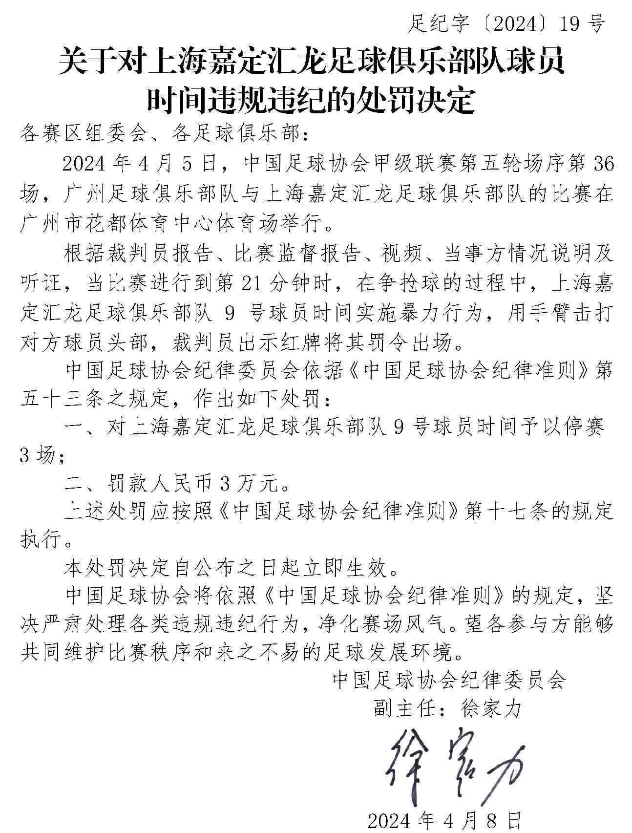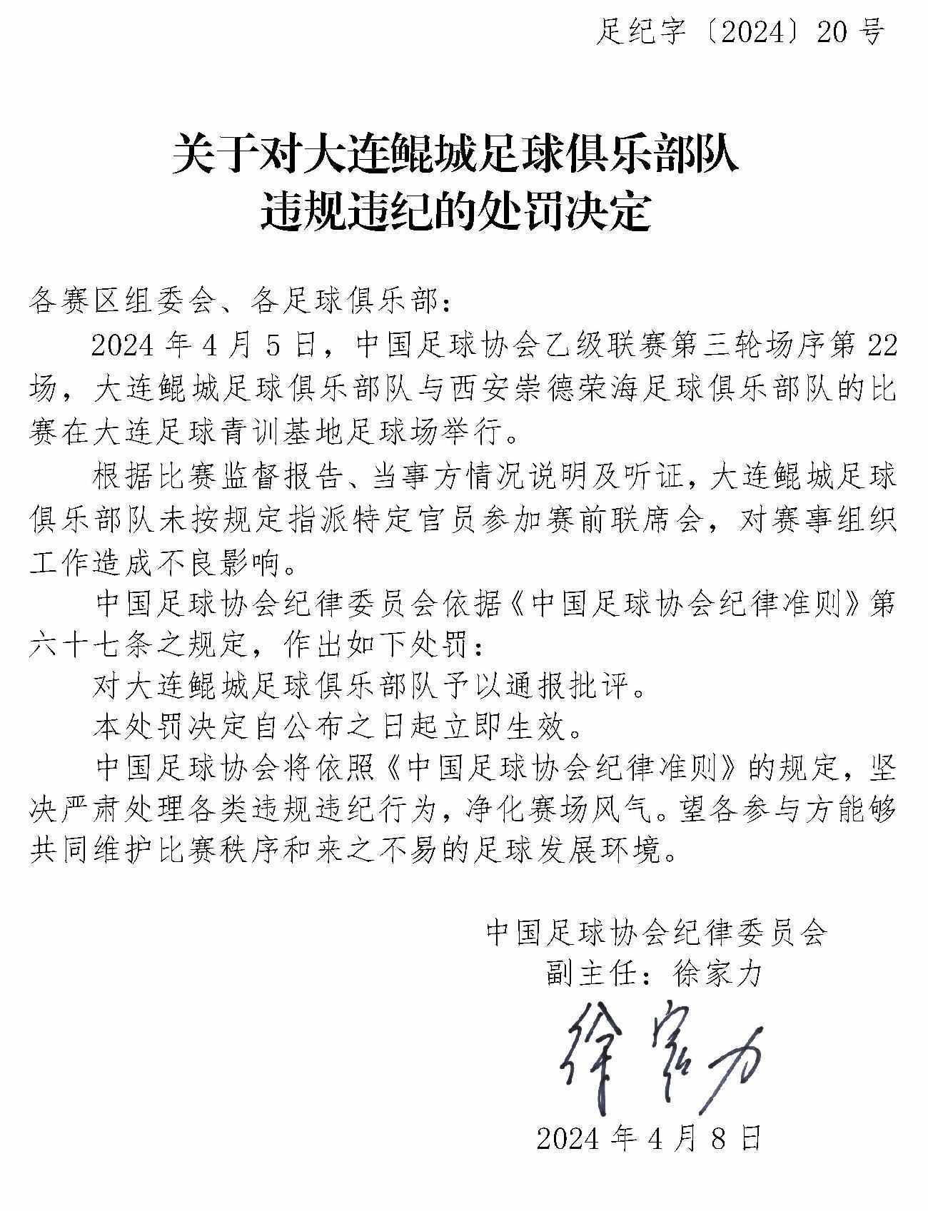 央視網(wǎng)消息:4月10日,中國足協(xié)網(wǎng)站發(fā)布《關(guān)于對上海嘉定匯龍足球俱樂部隊球員時間違規(guī)違紀的處罰決定》《關(guān)于對西安崇德榮海足球俱樂部隊違規(guī)違紀的處罰決定》《關(guān)于對大連鯤城足球俱樂部隊違規(guī)違紀的處罰決定》三份處罰決定。中甲聯(lián)賽上海嘉定匯龍9號球員因暴力行為被停賽罰款。中乙聯(lián)賽大連鯤城與西安崇德榮海兩家俱樂部因未按規(guī)定指派特定官員參加賽前聯(lián)席會,被通報批評。