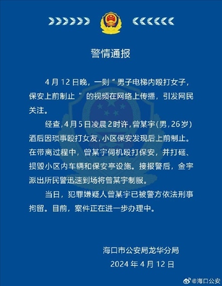 ·男子酒后毆打女友被保安制止,??诰剑悍缸锵右扇艘驯恍叹?。