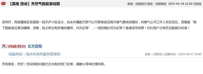 中新網(wǎng)4月17日電(中新財(cái)經(jīng)記者 吳濤)近日,在“問(wèn)政四川”平臺(tái)上,不少網(wǎng)友反映“更換新表后燃?xì)赓M(fèi)異常上漲”,這些留言顯示來(lái)自四川成都、自貢、廣安、南充等多地,僅僅在4月16日,保守估計(jì)就有十幾條;17日上午又出現(xiàn)十幾條。大部分尚未得到回復(fù),部分獲得官方回復(fù)稱“留言已轉(zhuǎn)交給相關(guān)機(jī)構(gòu)進(jìn)行處理”。