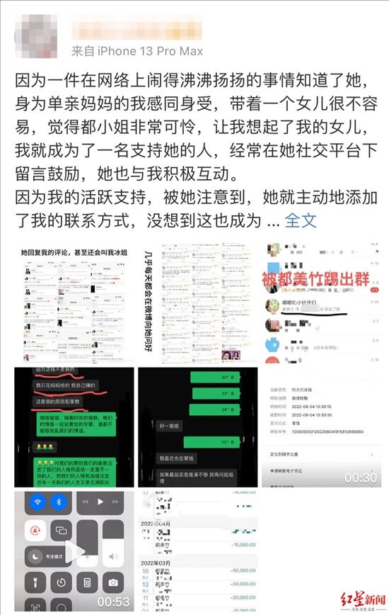 4月15日,都美竹粉絲朱姐發(fā)文稱,她先后給都美竹轉(zhuǎn)款近20萬元,現(xiàn)在認(rèn)為都美竹“賣慘”騙錢。她希望都美竹還錢,但對方只給她轉(zhuǎn)了3萬元。