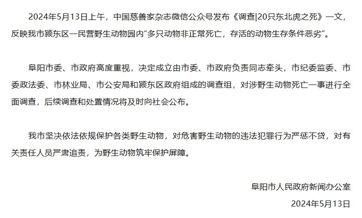 央視網(wǎng)消息:據(jù)“阜陽發(fā)布”微信公眾號消息,阜陽市人民政府新聞辦公室發(fā)布情況通報(bào),2024年5月13日上午,中國慈善家雜志微信公眾號發(fā)布《調(diào)查|20只東北虎之死》一文,反映阜陽市潁東區(qū)一民營野生動物園內(nèi)“多只動物非正常死亡,存活的動物生存條件惡劣”。
