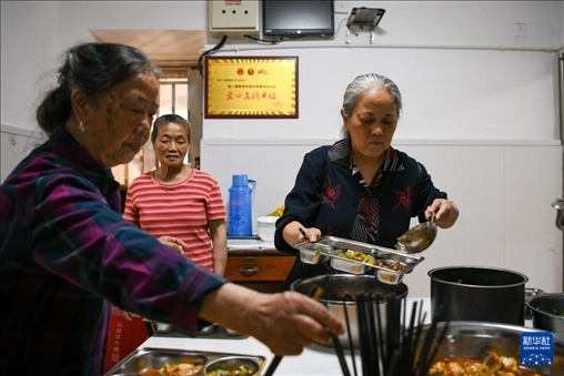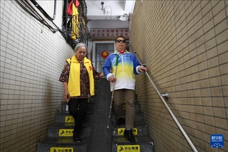 4月15日,馮懿蘋(右)與成都視障者互助協(xié)會家屬志愿者為樂隊成員準(zhǔn)備午飯。新華社記者 胥冰潔 攝