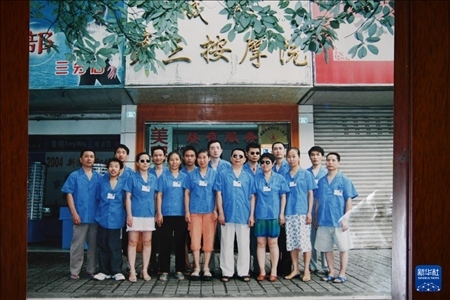 這是4月15日翻拍的張世維(前排右四)與當(dāng)年按摩店店員們的合影。新華社記者 胥冰潔 攝