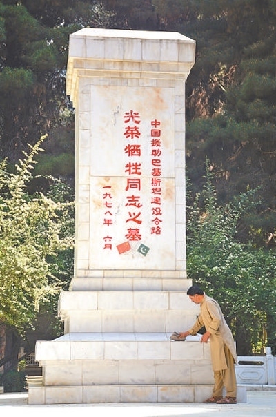 巴基斯坦北部城市吉爾吉特東郊的丹沃爾村有一座中國烈士陵園。1966年至1978年,中國援助巴基斯坦修建喀喇昆侖公路。12年間,數(shù)百名中國工程技術(shù)人員獻(xiàn)出了生命,其中88人安葬在此。從1978年起,艾哈邁德和父親在這里守陵,每天打掃陵園。圖為艾哈邁德在擦拭紀(jì)念碑。本報巴基斯坦分社 賽義德·邁赫迪攝