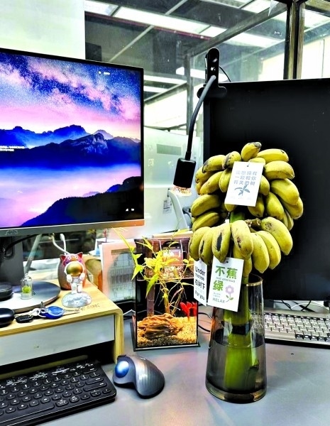 “現(xiàn)在大家工作都挺累的,職場里稍微有一點令人感到驚喜和有趣的話題,大家好像就會變得很開心?!眳芹谑且幻来畈┲?,自從他開始在辦公桌上養(yǎng)香蕉之后,單位的很多同事都會好奇地走過來瞧瞧。