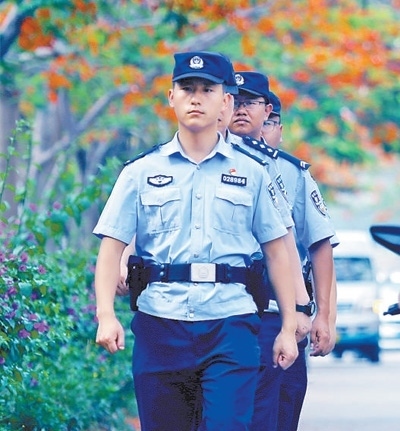 民警在綠汁鎮(zhèn)鳳凰花大道巡邏。