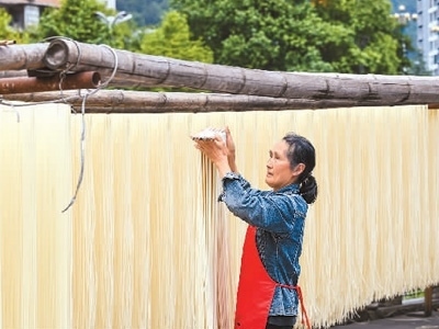 在重慶市酉陽(yáng)土家族苗族自治縣桃花源街道河濱掛面加工作坊,村民正在晾曬傳統(tǒng)手工掛面。邱洪斌攝(人民視覺(jué))