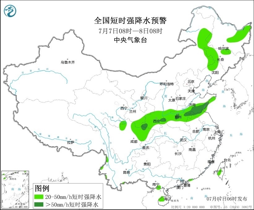 預(yù)計(jì)7月7日08時(shí)至8日08時(shí),內(nèi)蒙古東北部、黑龍江東北部和西南部、吉林北部、青海東南部、甘肅東南部、陜西南部、山西西南部、山東南部、河南中部、安徽北部、江蘇北部、四川北部、重慶西部等地的部分地區(qū)將有8級以上雷暴大風(fēng)或冰雹天氣,其中,山東南部、河南東部、安徽北部、江蘇北部等地的部分地區(qū)將有10級以上雷暴大風(fēng),最大風(fēng)力可達(dá)11級以上;內(nèi)蒙古東部、黑龍江中東部、吉林中西部、遼寧北部、甘肅東南部、陜西中南部、山西南部、山東中南部、河南中北部、安徽北部、江蘇北部、四川北部、海南島西北部、臺灣島西南部等地的部分地區(qū)將有小時(shí)雨量大于20毫米的短時(shí)強(qiáng)降水天氣,其中,陜西東南部、山東南部、河南中部、江蘇北部、四川盆地西北部等地的部分地區(qū)將有小時(shí)雨量大于50毫米,最大可達(dá)70毫米以上。