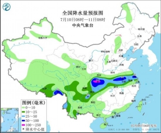 全國降水量預(yù)報(bào)圖(7月10日08時(shí)-11日08時(shí))