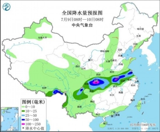 全國降水量預(yù)報(bào)圖(7月9日08時(shí)-10日08時(shí))