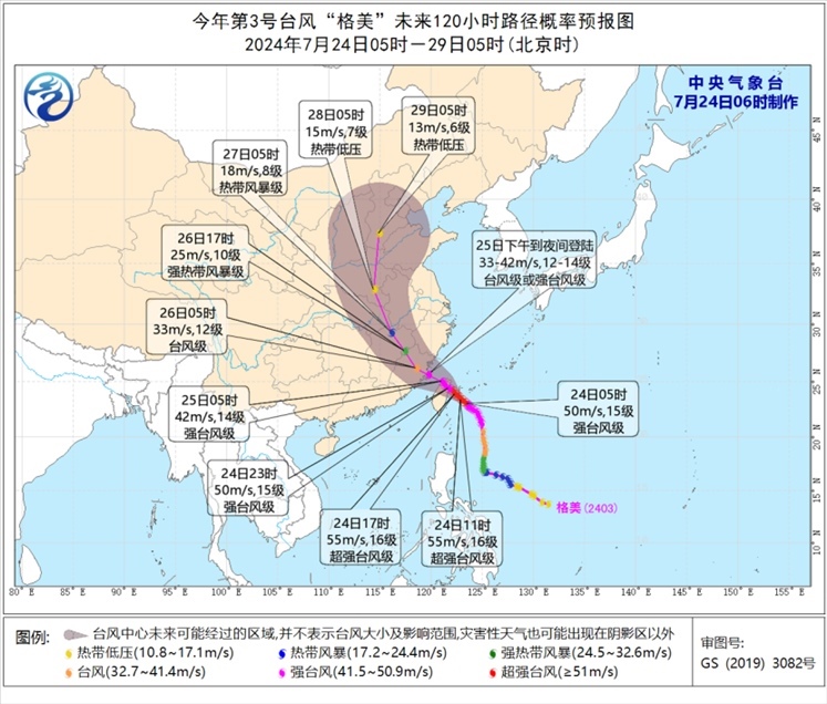 預計,“格美”將以每小時10-15公里的速度向西北方向移動,強度逐漸增強,最強可達超強臺風級(52-58米/秒,16-17級),并將于24日晚上在臺灣島中北部沿海登陸(強臺風級,14-15級,45-50米/秒)。之后穿過臺灣島,將于25日下午到夜間在福建福鼎到晉江一帶沿海登陸(臺風級或強臺風級,12-14級,33-42米/秒)。然后深入內(nèi)陸北上,強度逐漸減弱。