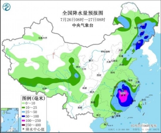 7月25日08時(shí)至26日08時(shí),內(nèi)蒙古東部、吉林、遼寧、天津、河北東部、河南北部、山東北部、浙江南部、福建、廣東東部、臺(tái)灣島等地部分地區(qū)有大到暴雨,其中,內(nèi)蒙古東南部、遼寧中西部、河北東北部、山東北部、浙江南部、福建東部、廣東東南部、臺(tái)灣島大部等地部分地區(qū)有大暴雨,福建東北部、臺(tái)灣島中南部等地局地特大暴雨(250~500毫米)。