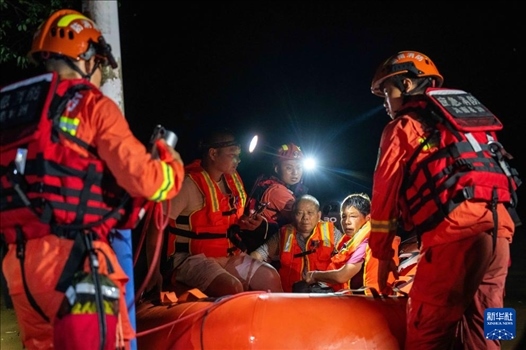 7月29日凌晨,在湖南省湘潭縣易俗河鎮(zhèn)四新堤附近,搶險人員在轉(zhuǎn)移被困群眾。新華社記者 陳思汗 攝