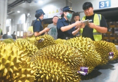 日前,在廣西憑祥市友誼關(guān)口岸海關(guān)查驗平臺,工作人員查驗一批進(jìn)口榴蓮。新華社記者 陸波岸攝