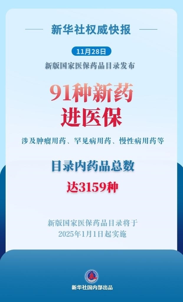 國(guó)家醫(yī)保局11月28日召開新聞發(fā)布會(huì),發(fā)布新版國(guó)家醫(yī)保藥品目錄調(diào)整情況。本次調(diào)整共新增91種藥品,包括腫瘤用藥、糖尿病等慢性病用藥、罕見病用藥、抗感染用藥、中成藥、精神病用藥等。同時(shí),調(diào)出43種臨床已替代或長(zhǎng)期未生產(chǎn)供應(yīng)的藥品。