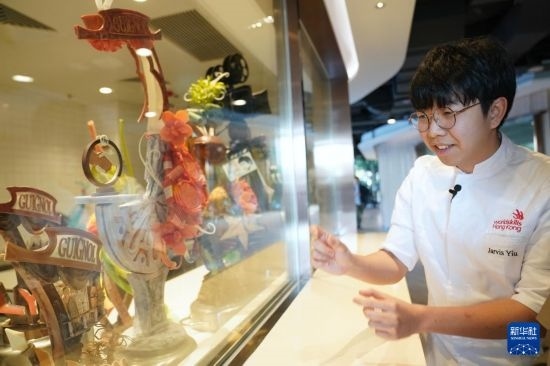 在香港國際廚藝學(xué)院西點廚房,姚浩民在介紹“2024年里昂世界技能大賽”西點制作項目的銀牌作品(1月15日攝)。新華社發(fā)(王申攝)