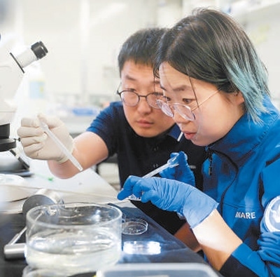 “雪龍2”號(hào)科考船上,考察隊(duì)員遲旭朋(左)和武佳星在船載實(shí)驗(yàn)室對(duì)南極浮游生物進(jìn)行分樣。