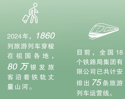 今年2月,商務(wù)部、文化和旅游部、中國國家鐵路集團有限公司等9單位聯(lián)合發(fā)布《關(guān)于增開銀發(fā)旅游列車促進服務(wù)消費發(fā)展的行動計劃》,指出要擴容旅游列車線路和產(chǎn)品,豐富銀發(fā)旅游列車產(chǎn)品供給,建立品質(zhì)型、舒適型、普惠型產(chǎn)品體系。目前,全國18個鐵路局集團有限公司已共計安排出75條旅游列車運營線。一趟趟銀發(fā)列車如春日繁花次第綻放,為老年人鋪就通往詩與遠方的旅途,更以流動的風(fēng)景線激活沿線文旅消費,為推動經(jīng)濟高質(zhì)量發(fā)展注入“銀發(fā)”新動能。