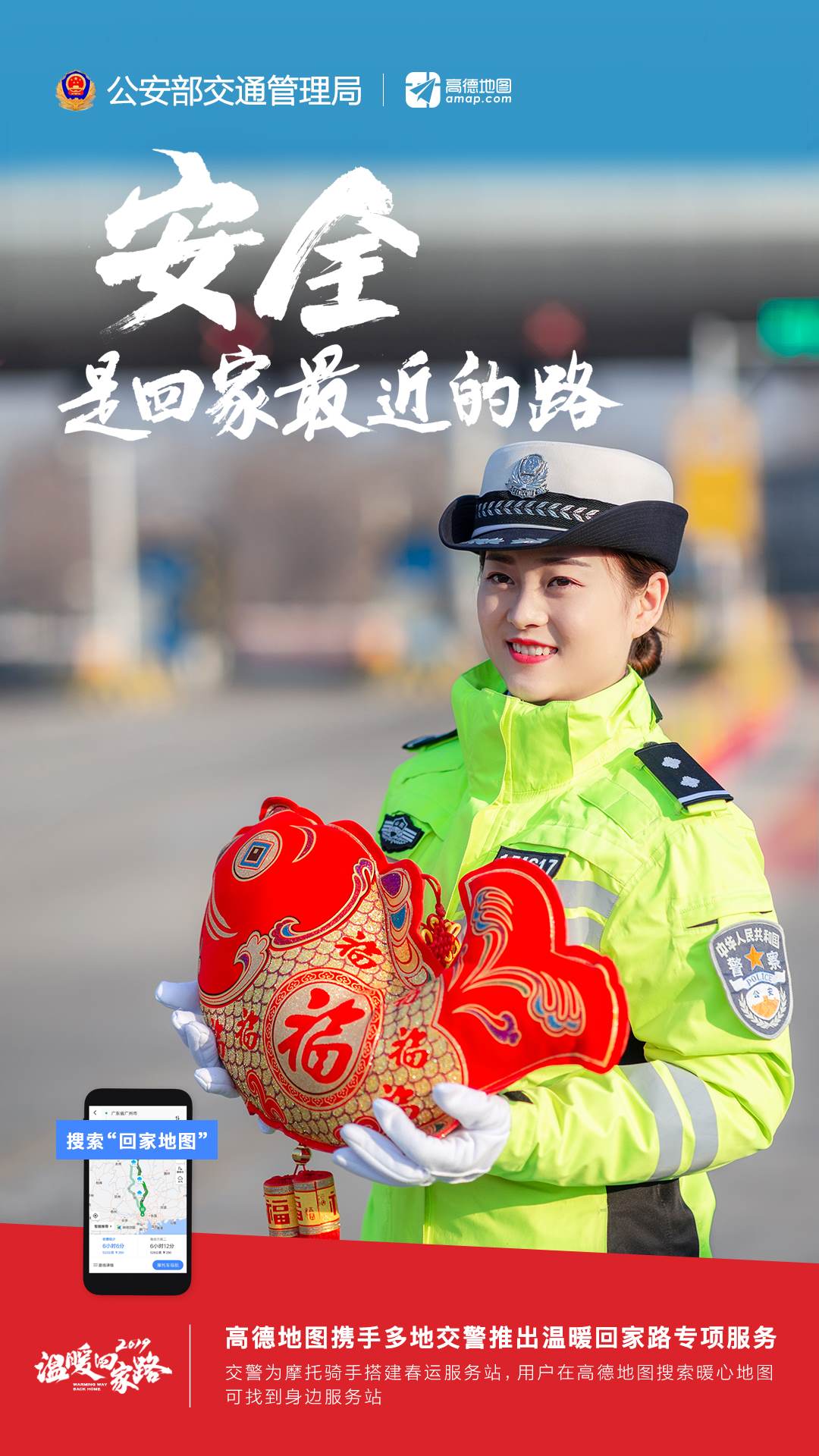 為做好2019年春運(yùn)保障工作,特別是發(fā)動社會力量做好交通安全社會協(xié)同治理,廣東、廣西、福建、江西、湖北、云南、安徽、四川、湖南等春運(yùn)重點(diǎn)省、自治區(qū)交警總隊(duì)聯(lián)合高德地圖啟動2019年春運(yùn)“溫暖回家路”專項(xiàng),推出“回家地圖”系列在線服務(wù),通過“交警+科技”結(jié)合,助力人民群眾安全返鄉(xiāng)。同時(shí),與人民日報(bào)社、新華社、中央廣播電視總臺等媒體,以及中廣聯(lián)合會、中國交通頻道等機(jī)構(gòu)和微博、秒拍、一直播等新媒體平臺聯(lián)動,共同開展2019年春運(yùn)交通安全宣傳工作。