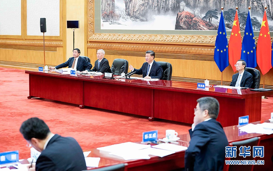 9月14日晚,國家主席習近平在北京同歐盟輪值主席國德國總理默克爾、歐洲理事會主席米歇爾、歐盟委員會主席馮德萊恩共同舉行會晤,會晤以視頻方式舉行。新華社記者李濤攝