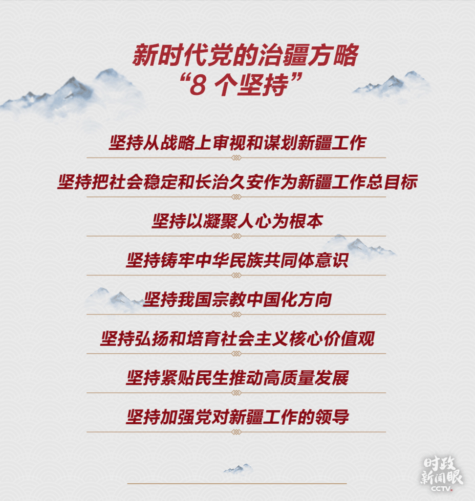 《時政新聞眼》發(fā)現(xiàn),時隔六年,“依法治疆、團結(jié)穩(wěn)疆、長期建疆”擴充為了“依法治疆、團結(jié)穩(wěn)疆、文化潤疆、富民興疆、長期建疆”,但“依法治疆”始終擺在第一位。
