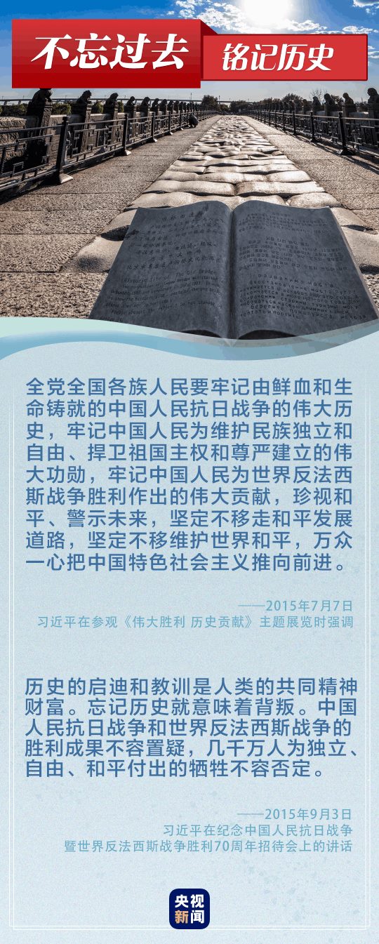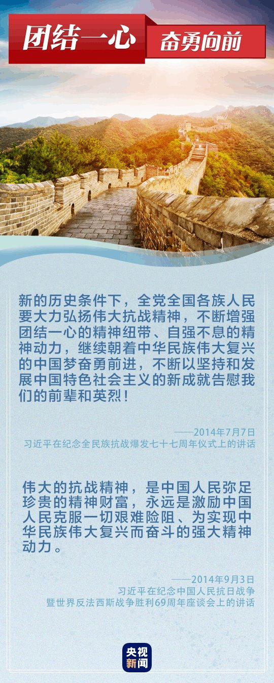 “偉大的抗戰(zhàn)精神,永遠(yuǎn)是激勵(lì)中國(guó)人民克服一切艱難險(xiǎn)阻、為實(shí)現(xiàn)中華民族偉大復(fù)興而奮斗的強(qiáng)大精神動(dòng)力?!薄罢x必勝!和平必勝!人民必勝!”黨的十八大以來(lái),習(xí)近平總書記多次談到抗戰(zhàn)精神。讓我們重溫總書記重要論述,銘記歷史、奮勇向前。
