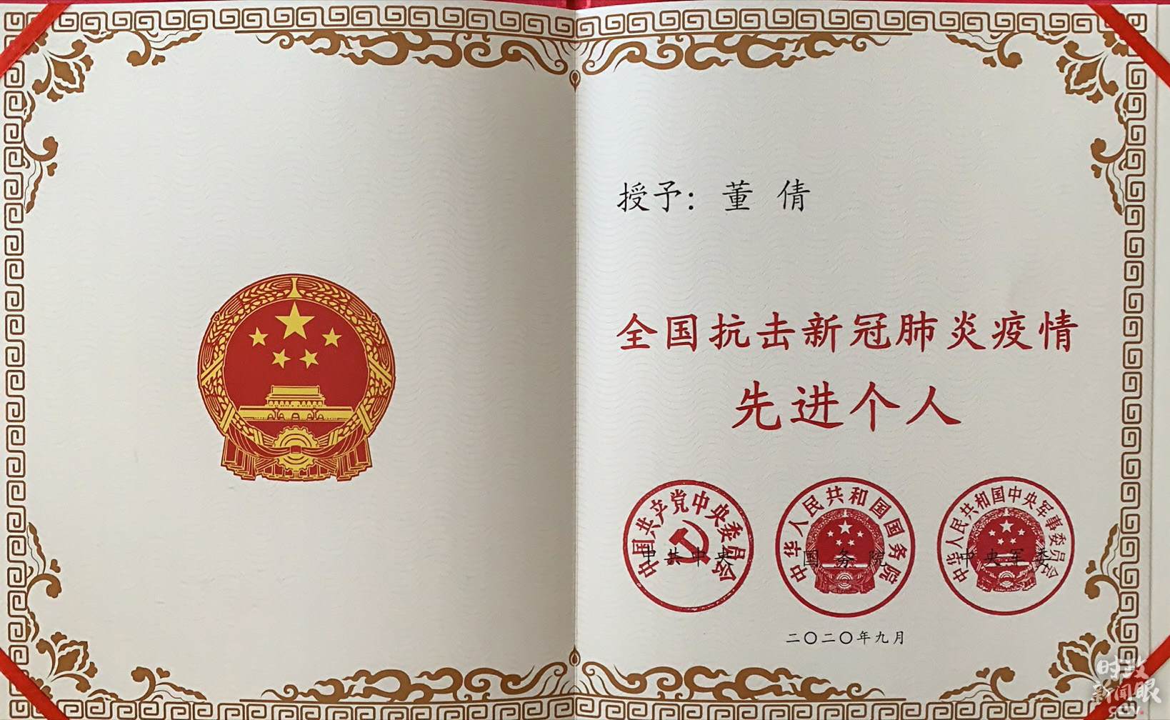 △中央廣播電視總臺主持人董倩獲得全國抗擊新冠肺炎疫情先進個人稱號。