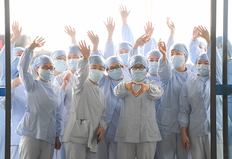 2020年3月23日,武漢市第一醫(yī)院部分醫(yī)護(hù)人員在武漢天河機(jī)場(chǎng)為廣東第14批援鄂醫(yī)療隊(duì)送行