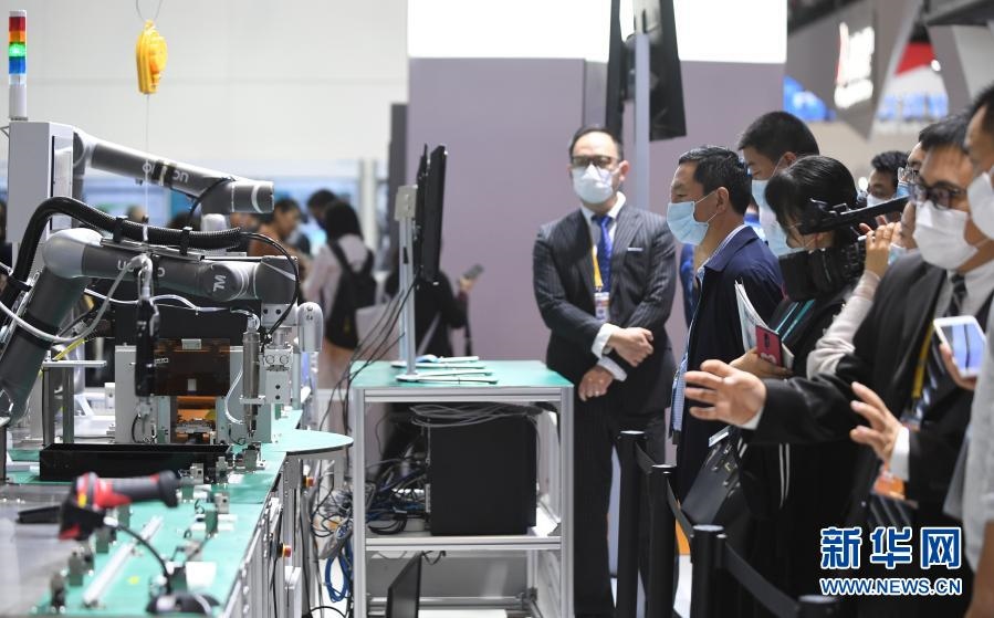 2020年11月6日,在進博會技術(shù)裝備展區(qū),人們在西門子展臺觀看人機協(xié)作的智能化單元生產(chǎn)線。新華社記者 李任滋 攝
