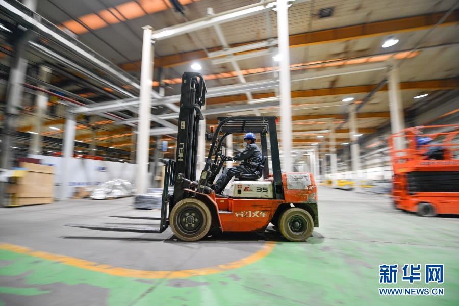 在中汽(天津)汽車裝備有限公司車間,工人在操作叉車(2月14日攝)。新華社發(fā)(孫凡越攝)