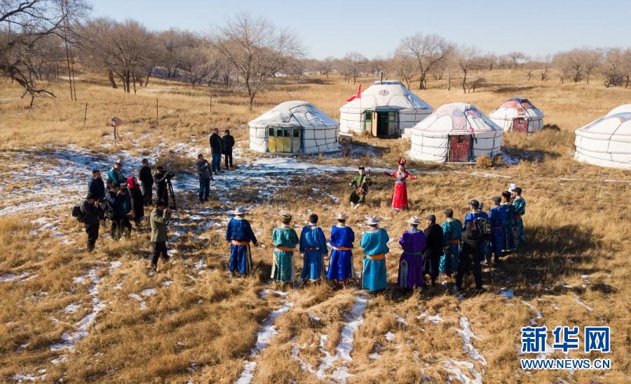 2018年11月9日,內(nèi)蒙古自治區(qū)錫林郭勒盟烏蘭牧騎隊員來到西烏珠穆沁旗烏蘭哈拉嘎蘇木新高勒嘎查的黨員中心戶恩克巴雅爾家,在戶外為周邊牧民表演節(jié)目(無人機照片)。新華社記者 彭源 攝
