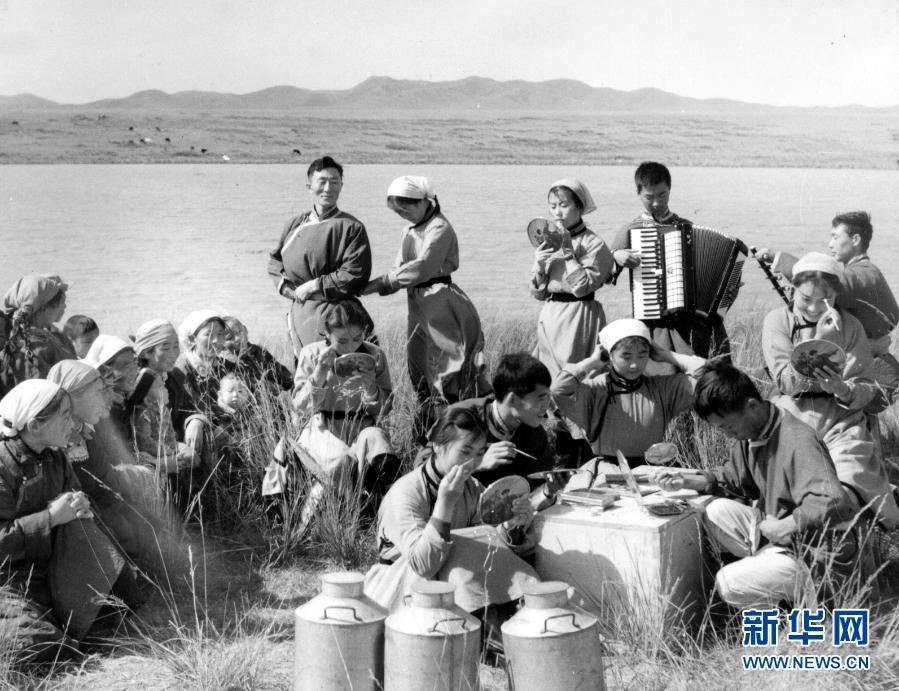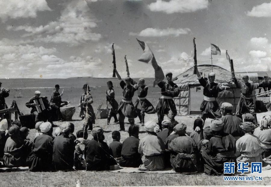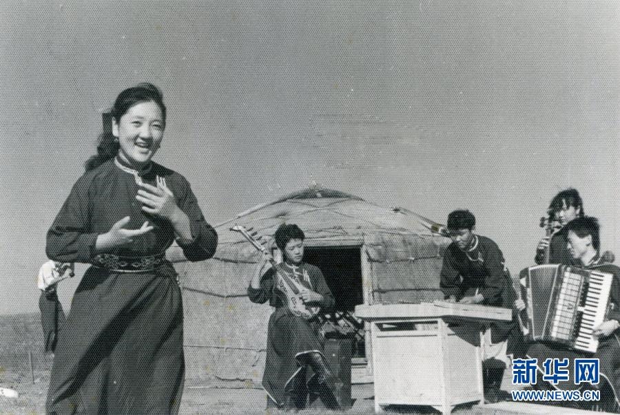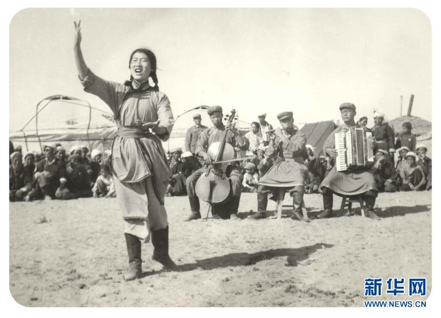 20世紀(jì)六七十年代,內(nèi)蒙古自治區(qū)錫林郭勒盟蘇尼特右旗烏蘭牧騎隊員在草原上為周邊牧民表演節(jié)目(資料照片)。新華社發(fā)