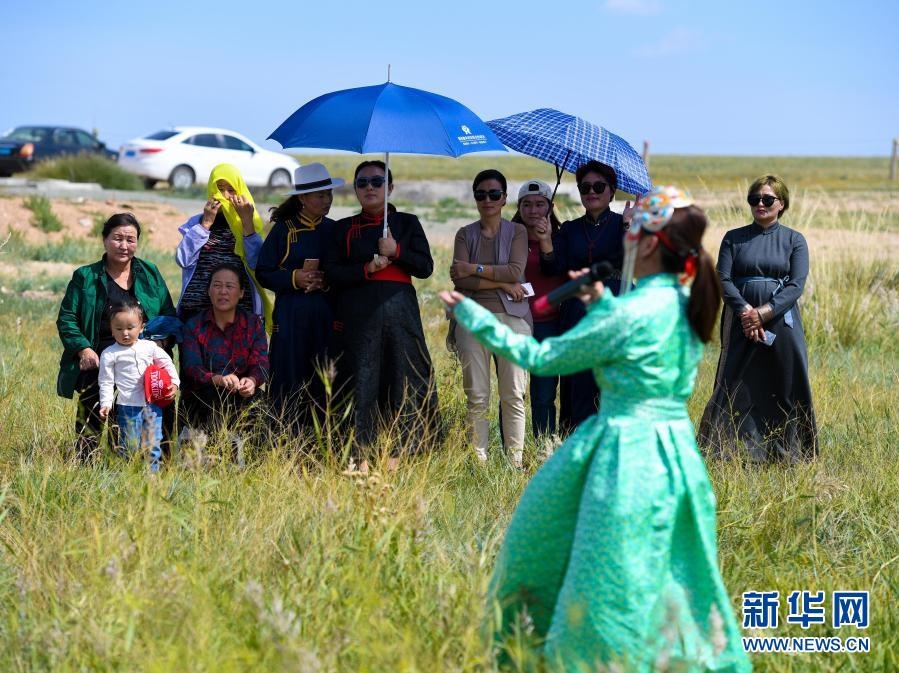 2018年9月13日,在內(nèi)蒙古自治區(qū)錫林郭勒盟鑲黃旗寶格達(dá)音高勒蘇木浩尼欽哈夏圖嘎查的一處草場,鑲黃旗烏蘭牧騎的隊員在為牧民表演文藝節(jié)目。新華社記者 彭源 攝